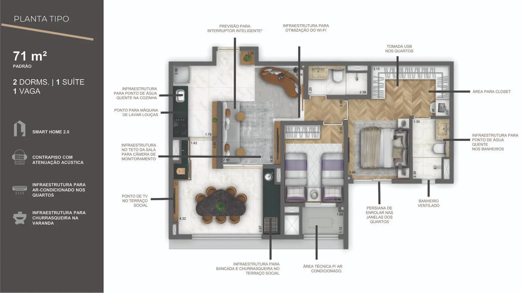 | 71m² | 1 Suíte + 1 Dormitório | 1 Vaga* |