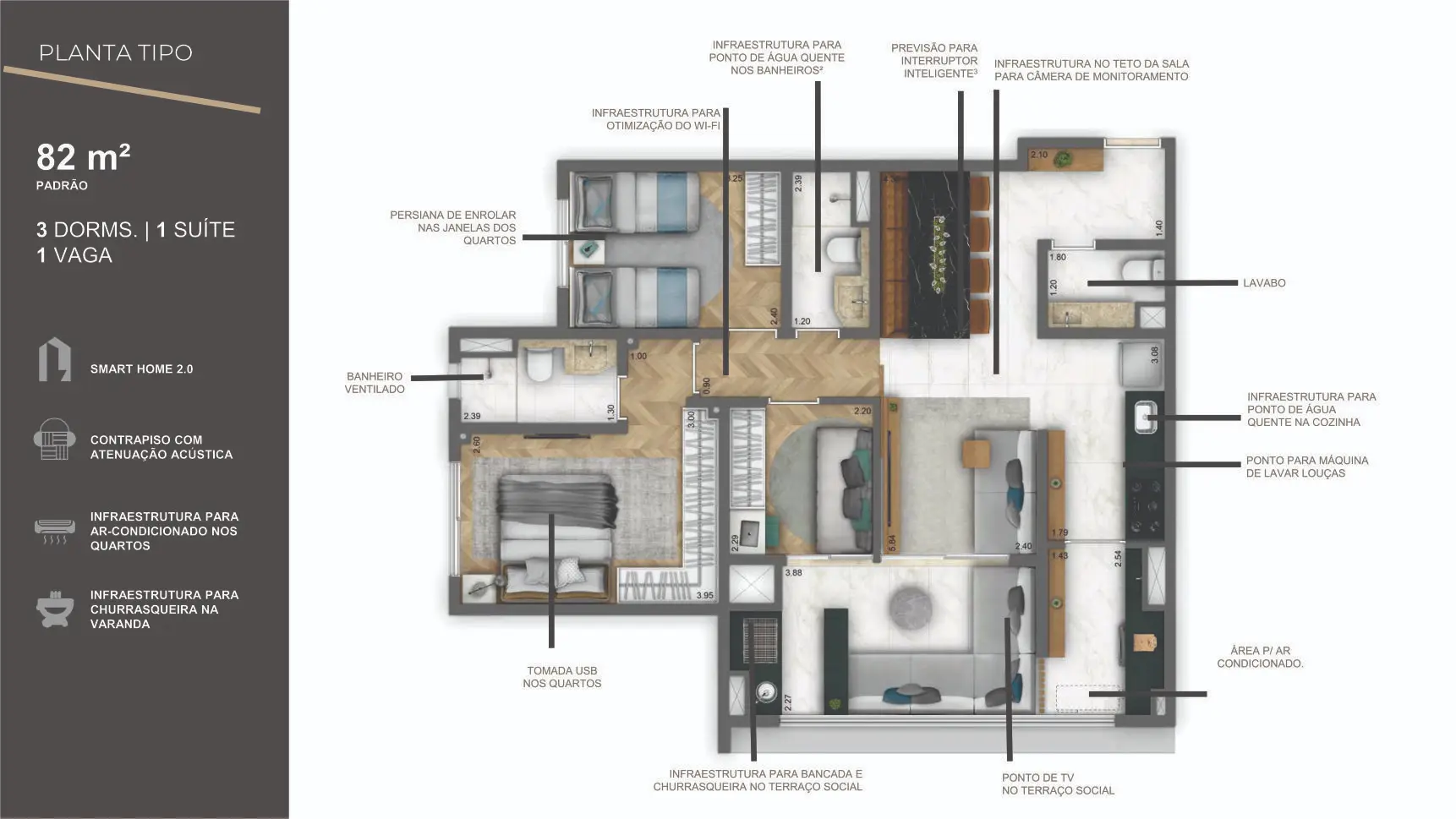 | 82m² | 1 Suíte + 2 Dormitórios | 1 Vaga determinada livre e coberta |