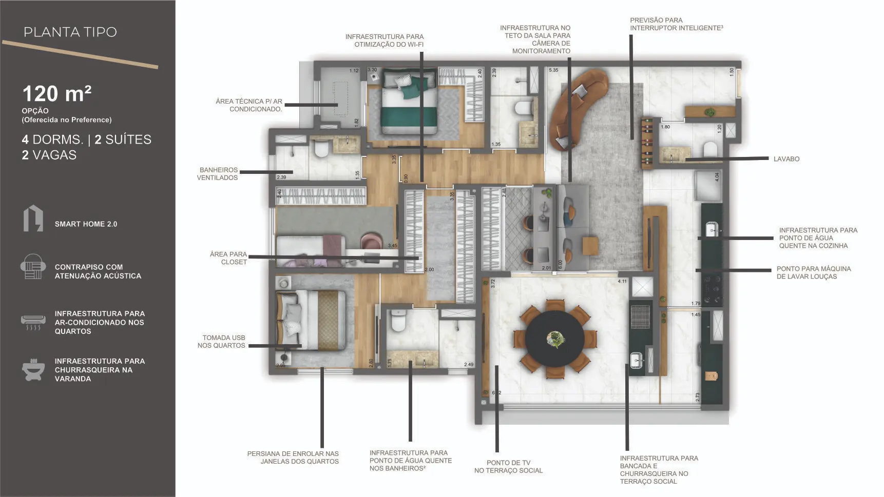 | 120m² (opção) | 2 Suítes + 2 Dormitórios | 2 Vagas determinadas e cobertas |