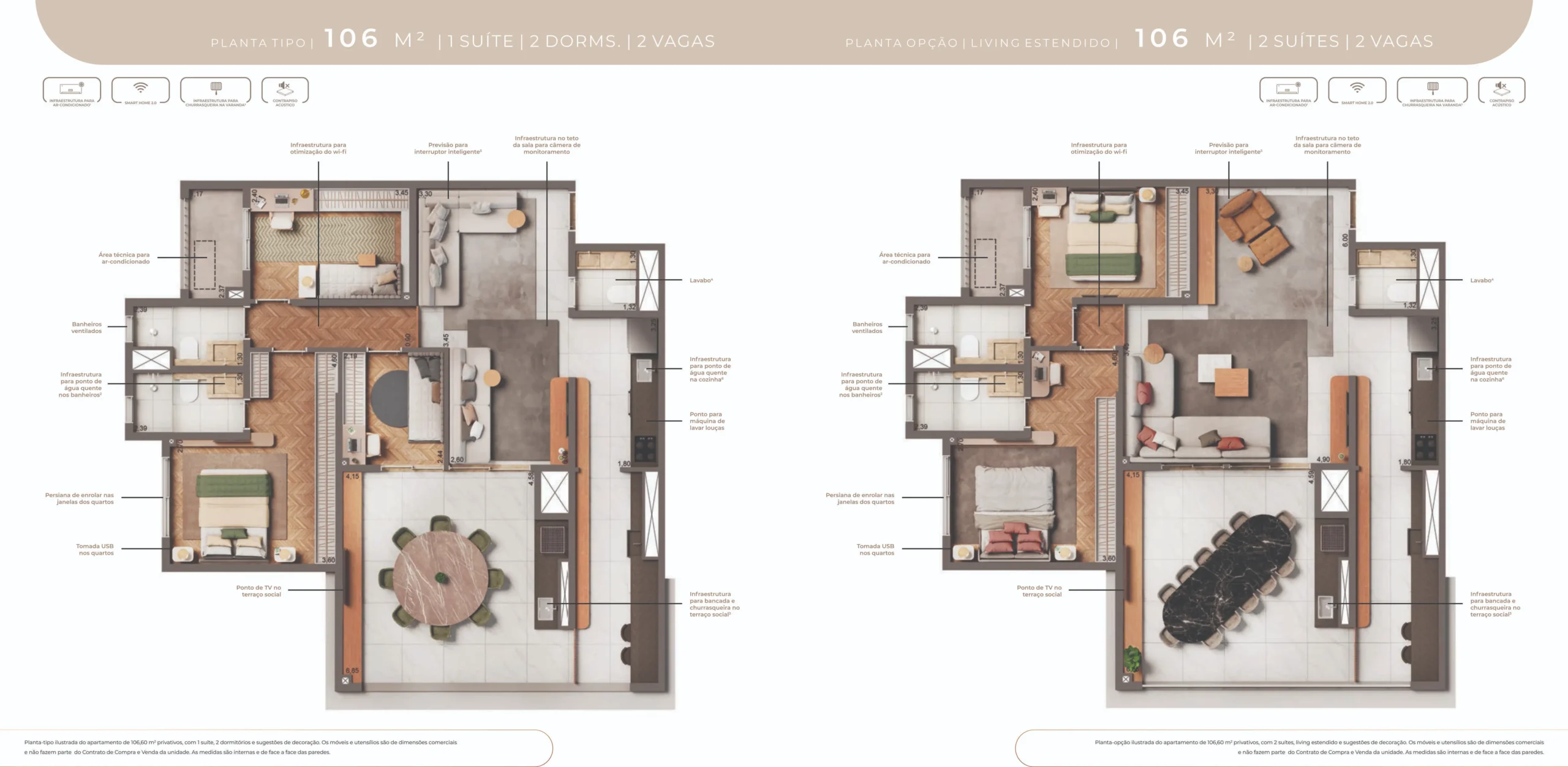 | 106m² | 1 Suíte + 2 Dormitórios | 2 Vagas** |