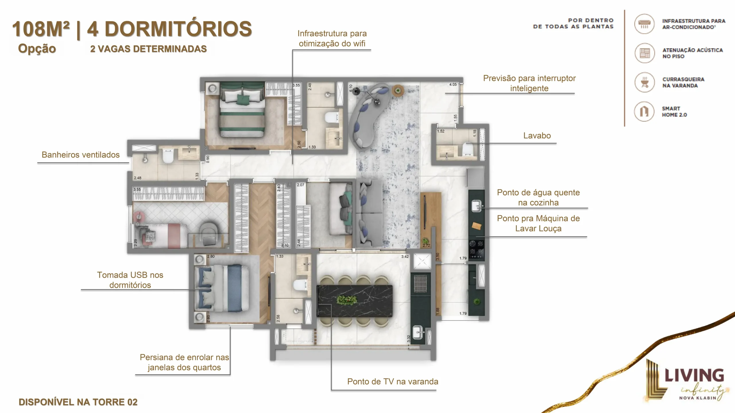 | 108 m² (opção) | 2 Suítes+ 2 Dormitórios | 2 vagas determinadas e cobertas |