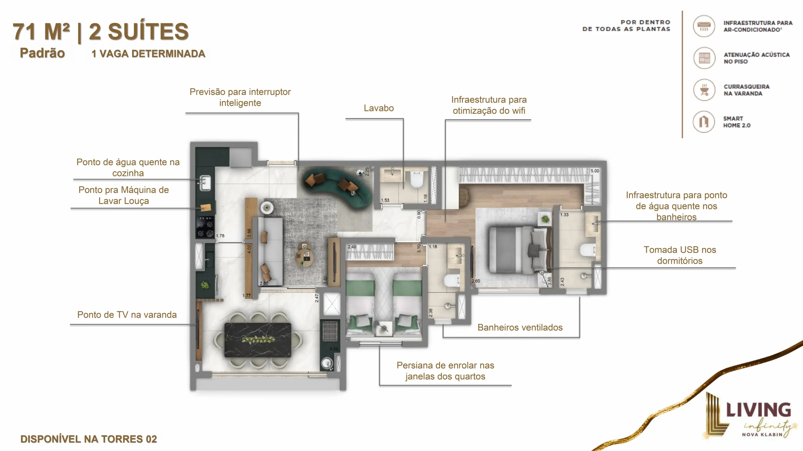 | 71 m² | 2 Suítes | 1 vaga determinada, coberta e livre |