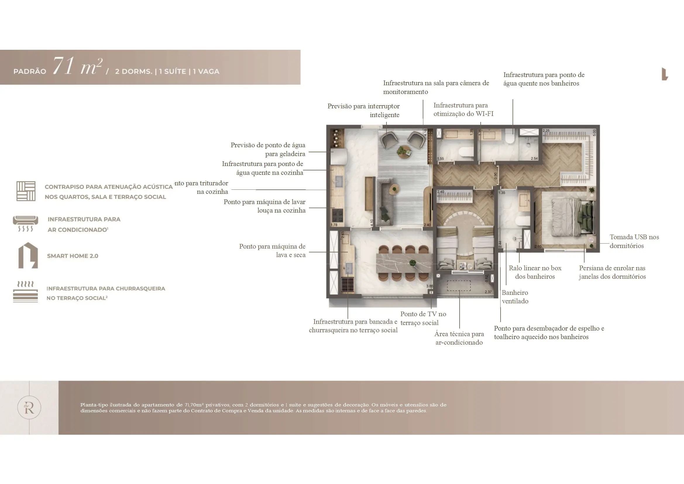 | 71m² (opção) | 2 Suítes | 1 Vaga * |