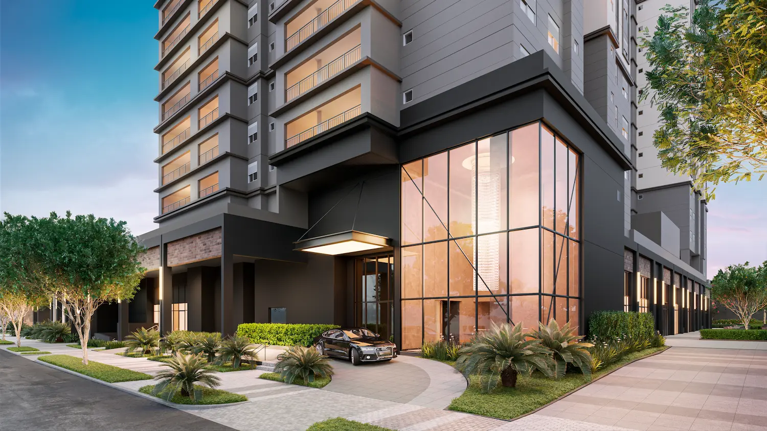 A arquitetura do empreendimento valoriza elegância e funcionalidade. Um Porte-Cochère imponente garante conforto e segurança para embarque e desembarque, enquanto a fachada sofisticada reforça a identidade moderna do projeto. Ao entrar, os moradores são recebidos por um lobby luxuoso com pé-direito triplo, que conecta sofisticação e amplitude desde o primeiro contato.
