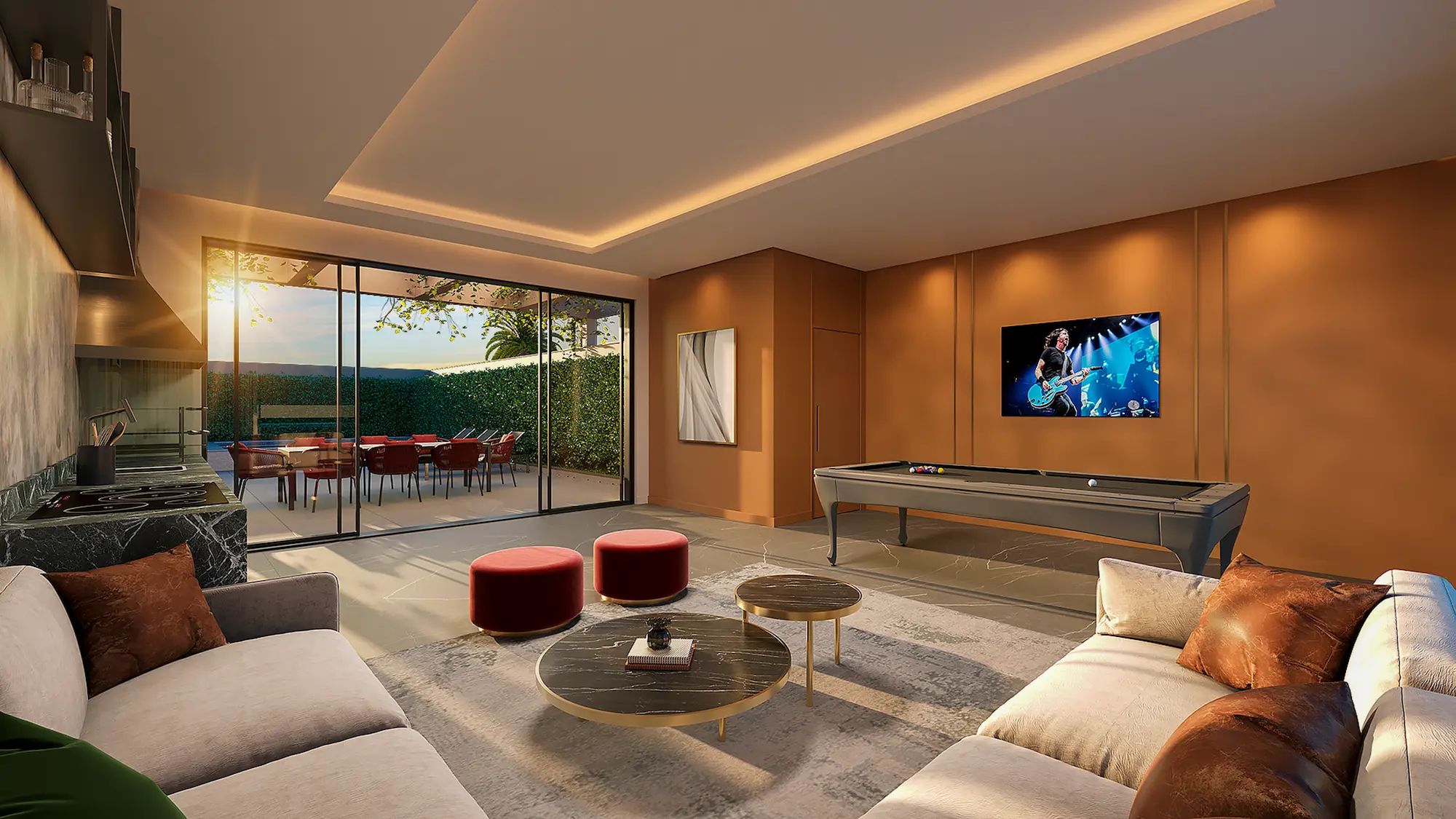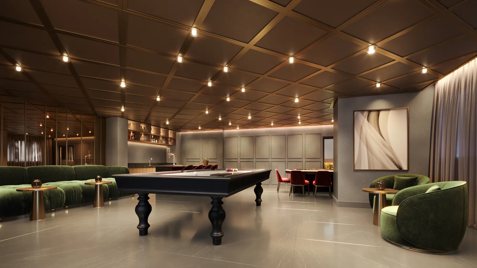 Para entretenimento, há espaços pensados para todas as idades. O salão de jogos adulto conta com mesa de poker, sinuca, choppeira e mobiliário elegante. Já o salão de jogos teen foi projetado com ambiente lúdico e tecnológico: simulador de corrida, videogames, puffs e até balanço. A Quadra de Tênis com medidas oficiais completa o cenário para os amantes de esporte.
