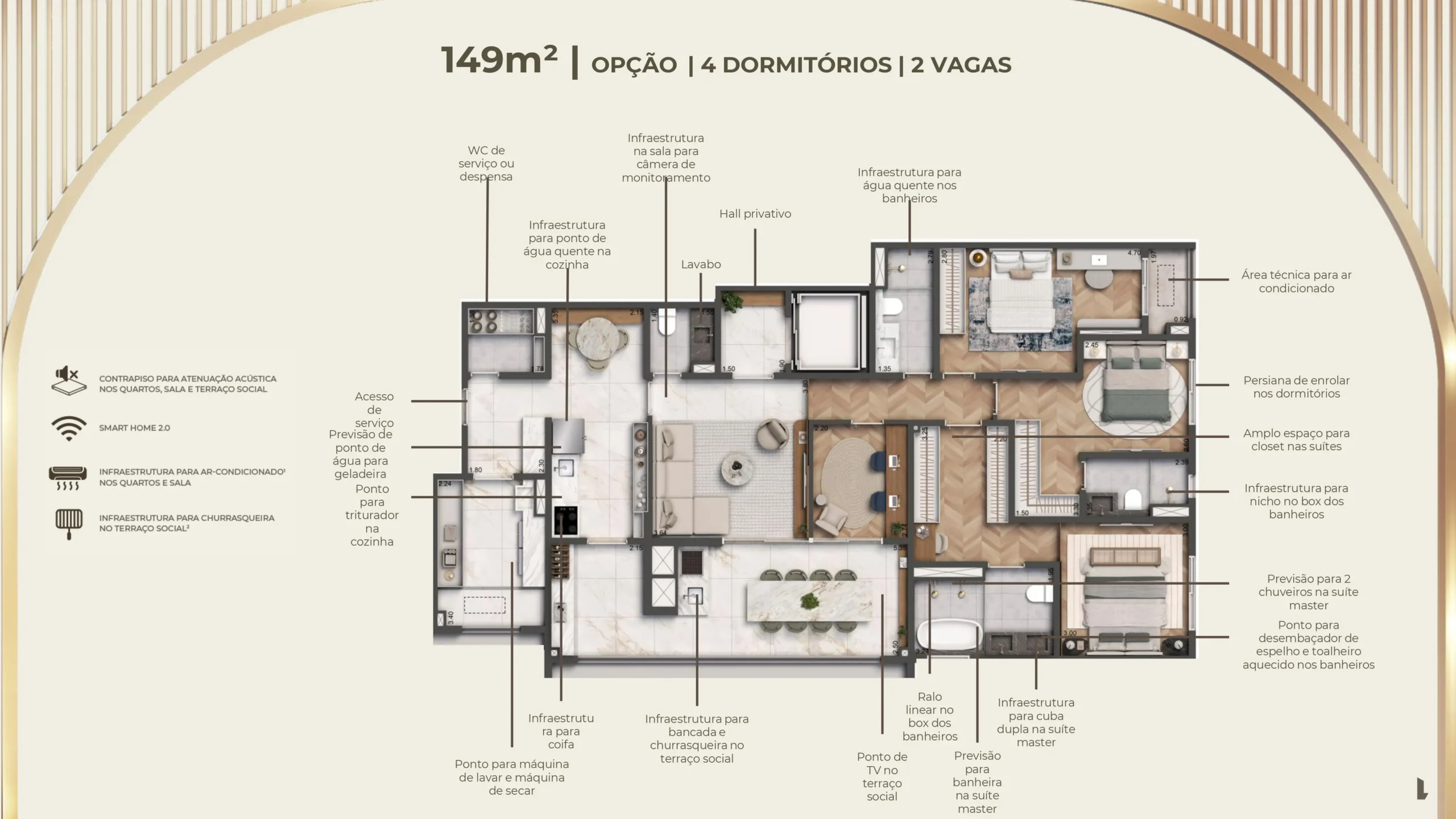 | 149 m² | Banheiro de Serviço | Cozinha Aberta | 3 suítes | 2 vagas |