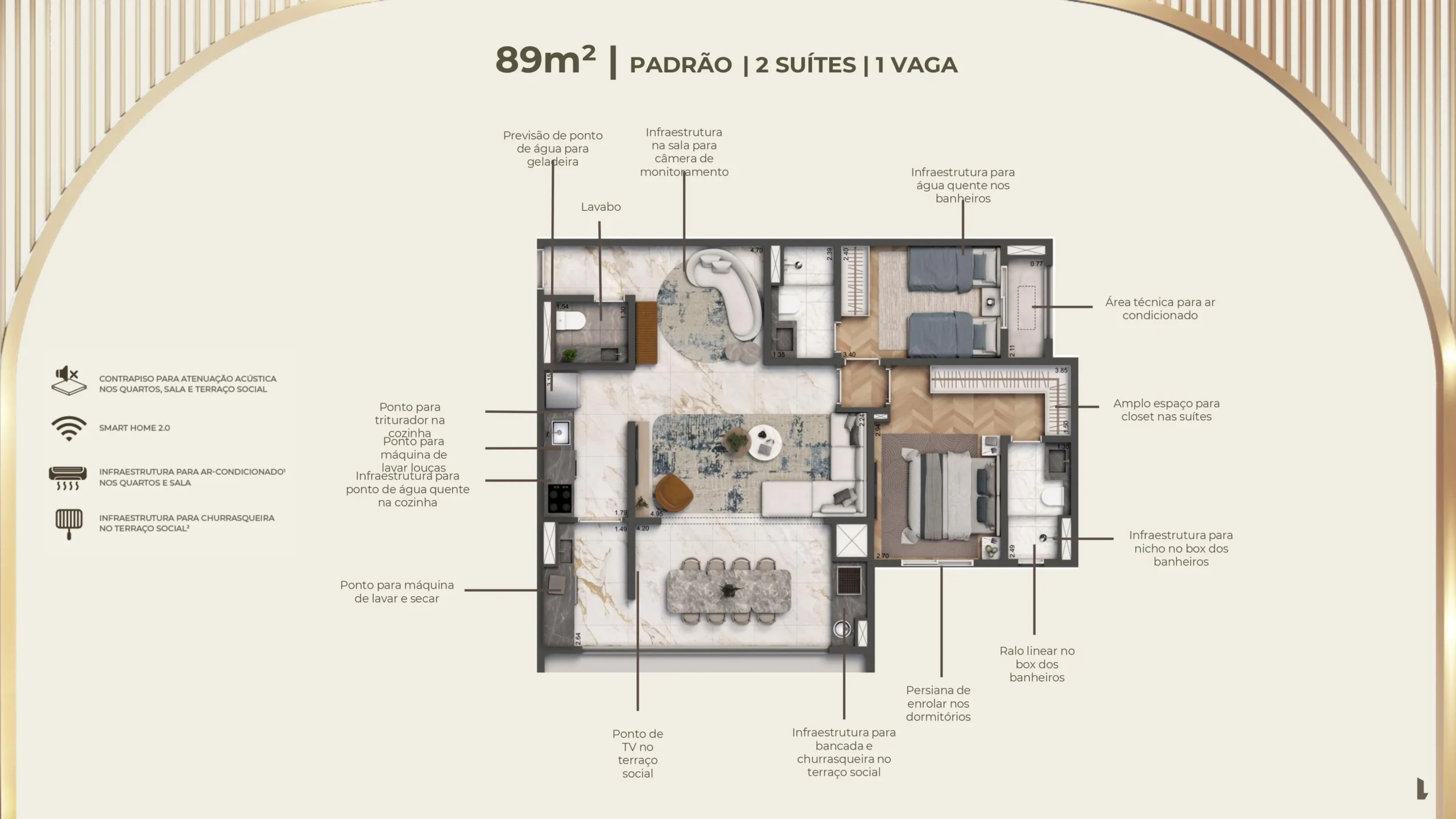 | 89 m² (opção) | 1 Suíte + 2 Dormitórios | 1 vaga |